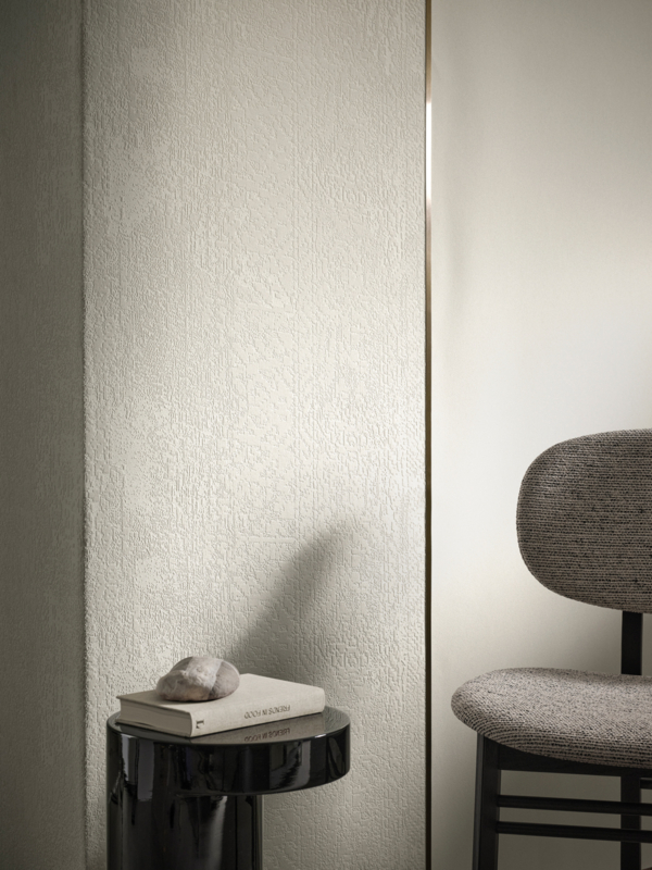 TRACCE is een verhaal dat zich geleidelijk ontvouwt, een patroon dat zich niet opdringt, maar zich naadloos integreert in de ruimte met een discrete en elegante aanwezigheid. Het oppervlak transformeert met het licht: van een afstand lijkt het uniform, terwijl het van dichtbij onverwachte, opzettelijk imperfecte details onthult. Geïnspireerd door handgeknoopte tapijten, herinterpreteert het traditionele motieven in een eigentijdse stijl, waarbij het verweerde oppervlakken oproept waar fragmenten van ontwerpen opduiken als zwevende herinneringen. Een dialoog tussen gravures en washes, geometrie en onregelmatigheid, een viering van de schoonheid en het vakmanschap van handgemaakt kunstenaarschap, terwijl het diepte en beweging aan de muur toevoegt.