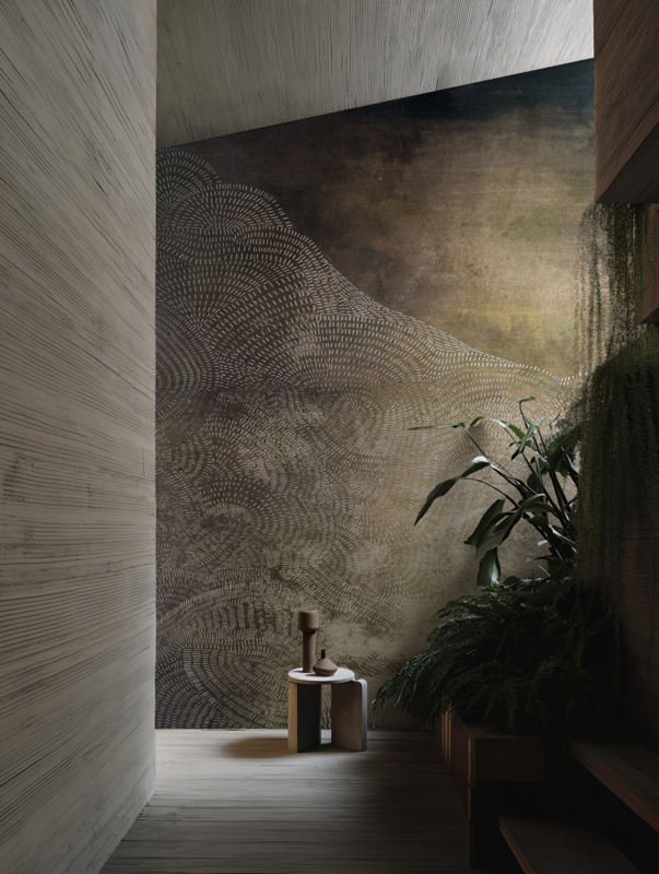 Luxe wandvullende behang mural op maat EPHEMERA ontworpen door Talva Design voor Wall and Deco Italie. Collectie 2026. Verkrijgbaar in 2 kleuren.