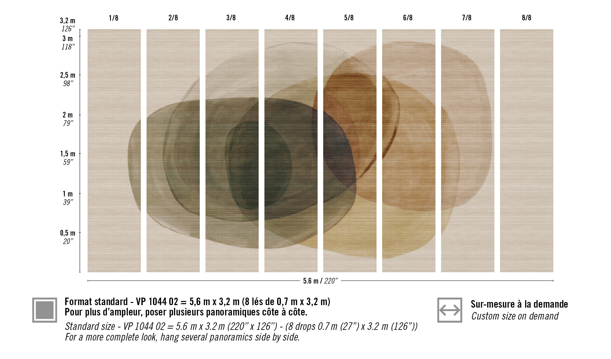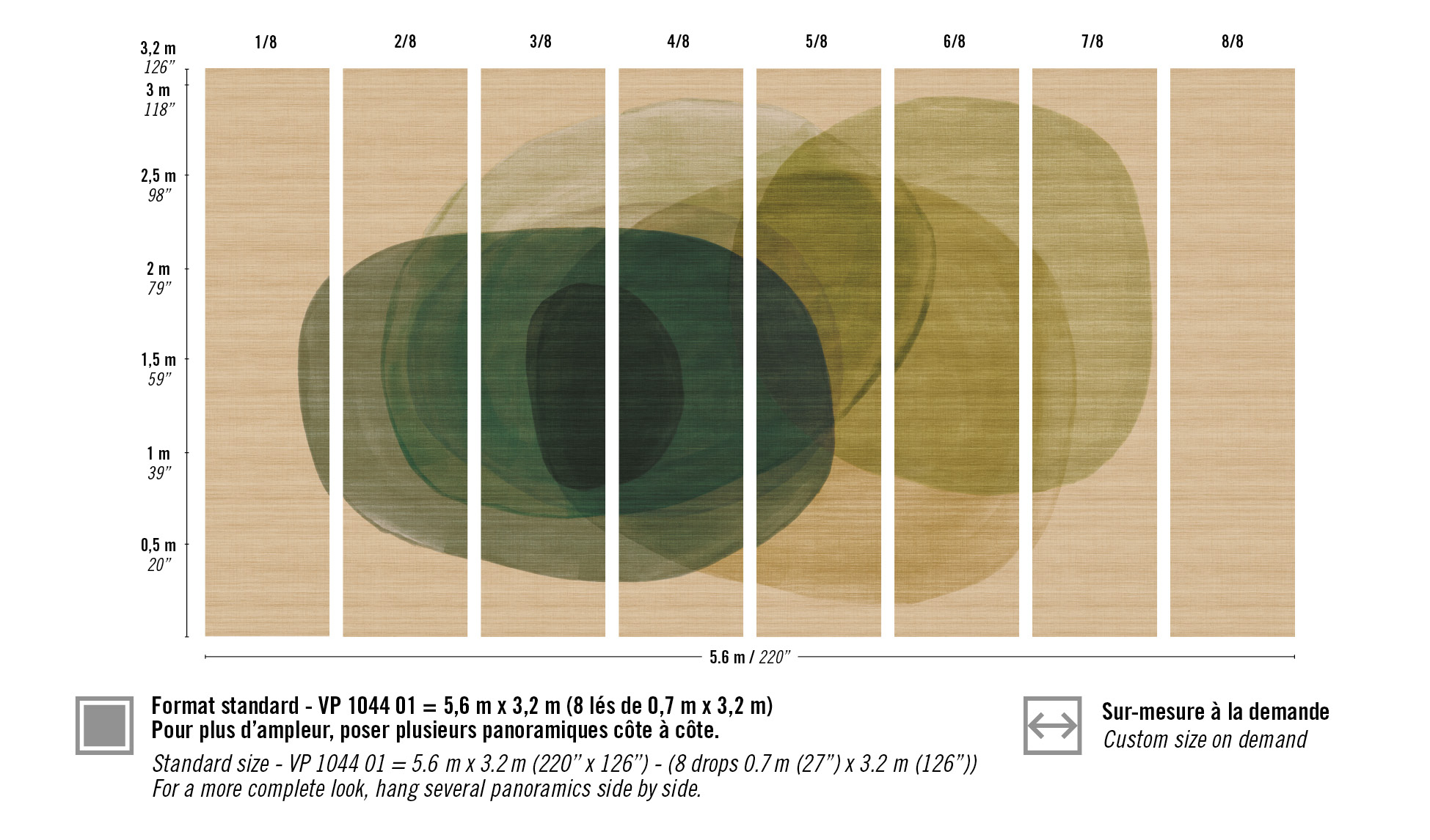 Standard of 5.6 m x 3.2 m (220'' x 126'') available in 8 drops of 0.7 m (27") or Custom size