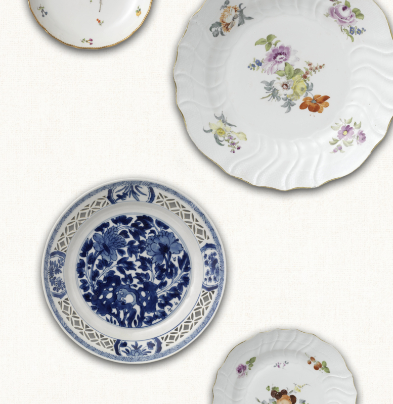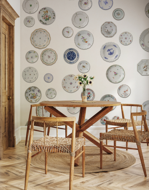 Behang PORCELAIN PLATES met heel veel antieke bordjes wordt geprint op een rol van b53 x h990 cm. De randen zijn altijd zonder design zodat je geen patroon hoeft te zoeken voor de volgende baan en daardoor het maximale uit een rol kunt halen! Ofwel goed voor ruim 5 m2 wand.