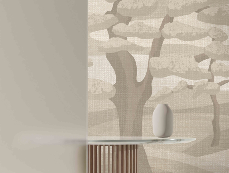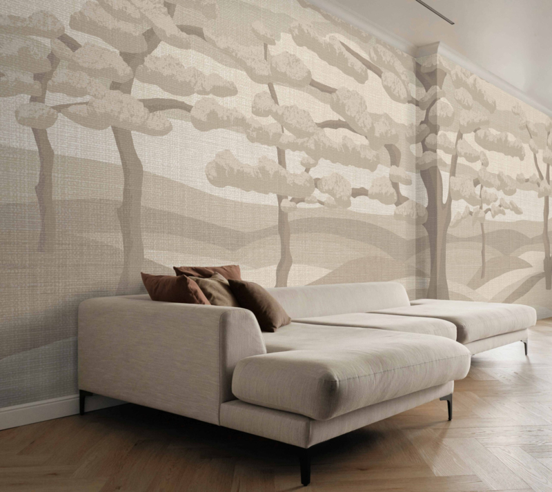 The Ilex Beige” van daisy james is een wandbekleding met een abstract, landschappelijk geïnspireerd ontwerp met een subtiel gestructureerd oppervlak. De zachte beige tinten, gecombineerd met donkere bomen op de achtergrond, creëren een lichte en kalme uitstraling. Het ontwerp brengt sereniteit en elegantie in een ruimte en vormt een ingetogen basis voor eigentijdse interieurs.