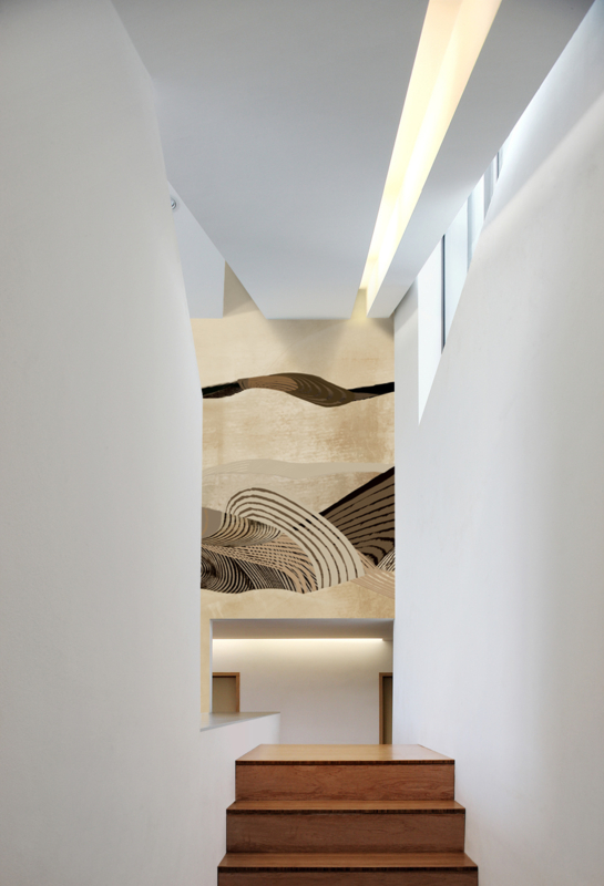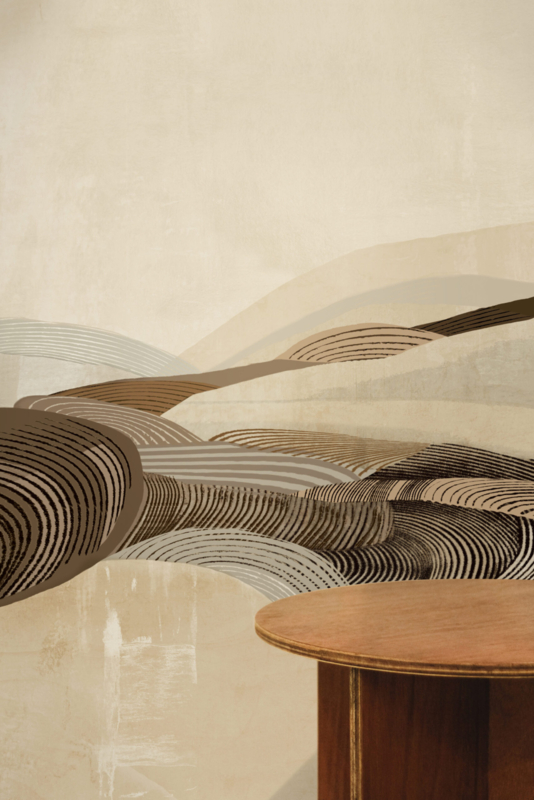 "The Luma" van daisy james brengt de serene schoonheid van een woestijnlandschap naar het interieur. Zachte zand-, beige- en bruintinten vloeien samen in een abstract patroon van horizontale vlakken, waardoor een warme, natuurlijke rust ontstaat met een moderne stijl.