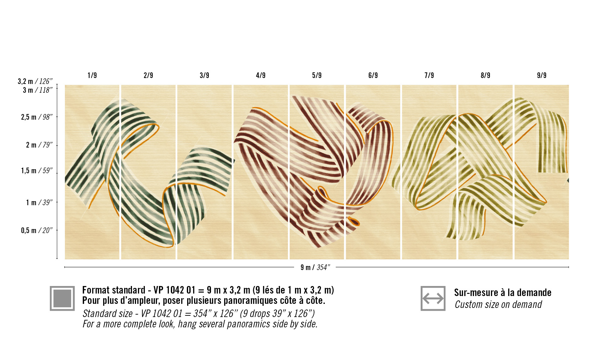 Standard of 9 m x 3.2 m (354'' x 126'') available in 9 drops of 1 m (39") or Custom size