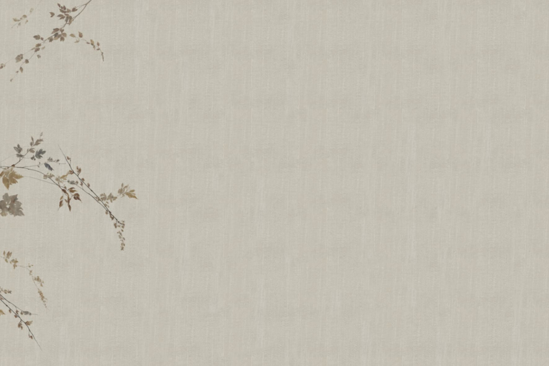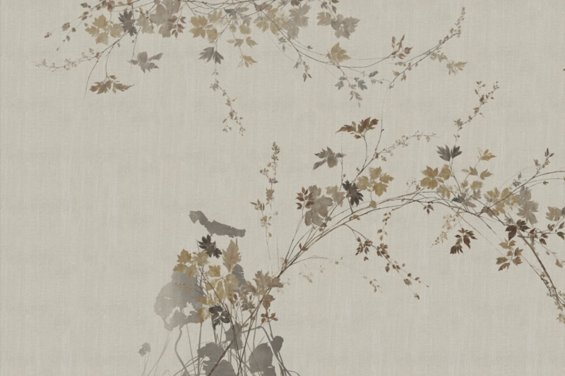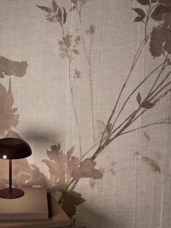 Slanke bamboestokken vormen een licht, verticaal ritme en vloeien samen met de textuur van het materiaal in een evenwicht tussen elegantie en ingetogenheid. Het zachte kleurenpalet, gevormd door natuurlijke tinten en gepolijste schaduwen, suggereert een verfijnde rust, waarin de muur een discrete en lichtgevende aanwezigheid vormt.