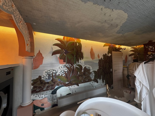 op zeer hoogwaardig vliesbehang met klein fraai relief in linnenstructuur in genummerde banen van 60 cm.