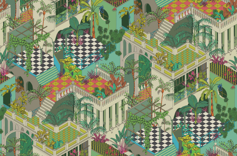 Paying homage to the epicentre of tropical, kitsch style, the exuberant Miami features giddy layers of terraced colonnades and lush tropical vegetation. Digitally printed, Miami is offered in Olive Multi, a palette of botanic greens and limes, and a moodier twilight colouring of Viridian Multi reflecting mid-century Deco architecture and glamour from day to night.