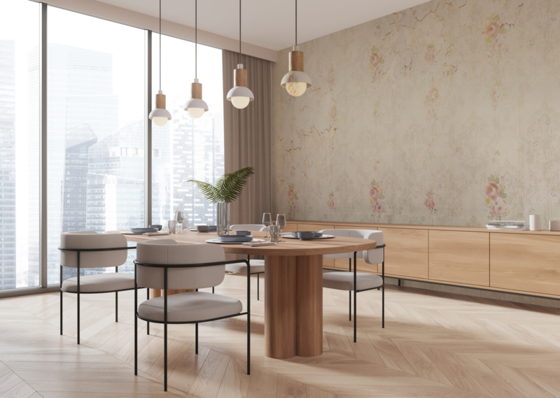 Geheel op maat geprint op zeer hoogwaardig vliesbehang met klein fraai relief in linnenstructuur in genummerde banen van 60 cm.