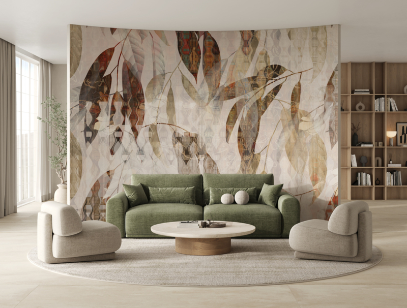 Prachtige behang mural ABSTRACT LEAVES in warme tinten. Een plaatje in elk interieur!