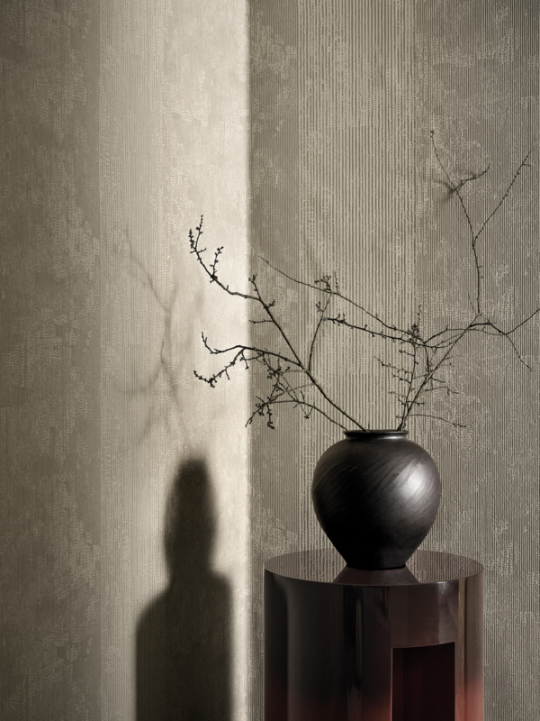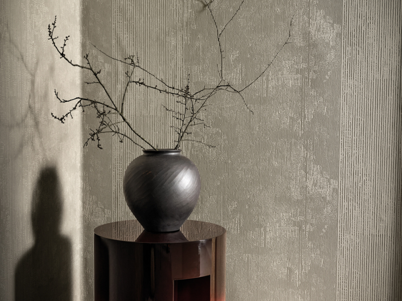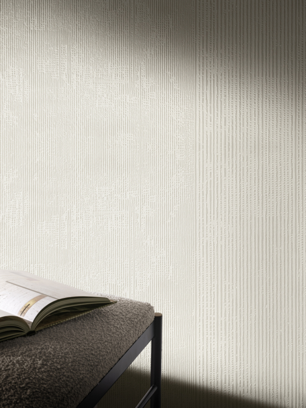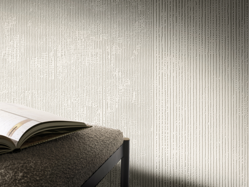 A rhythmic composition that reveals itself through light, an homage to the marks of time imprinted in the material. Characterised by a sequence of irregular grooves, the RILIEVI pattern features a surface crossed by alternating fine and bold vertical lines in a harmonious rhythm. A tactile architecture that recalls the effect left by the passage of a comb over a layer of fresh lime plaster, later softened by time. This delicate verticality enhances spatial perception and infuses interiors with effortless elegance and seamless continuity. Below you can download a 98 x 64 cm detail of the RILIEVI pattern.