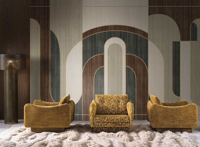 ALCOVES suggests a calm and refined place where architecture is a showcase. This design features a series of elegant arches, inspired by classical alcoves, adding a soft structure. A narrow golden outline delicately accentuates the arches, diffusing a muted light, whilst the walnut veneer establishes a warm and luxurious atmosphere, a discrete reference to the intimate interiors of Saint-Germain-des-Près.