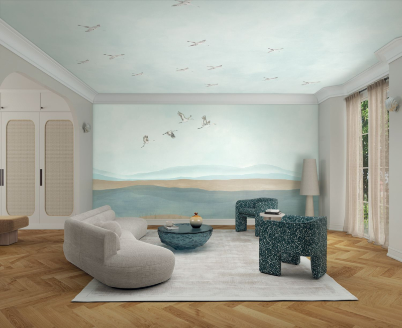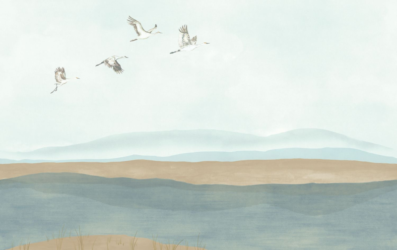 Like a gentle breath, birds take flight over the calm water of the lagoon. The sky blends with the sand, the light become transparent and the landscape seems to have been caught in time. LAGUNE captures this harmonious silence particular to the Arcachon Bay, between the sky and the sea. On a textured vinyl, the birds’ silhouettes glide through the air as if carried on the salty breeze.