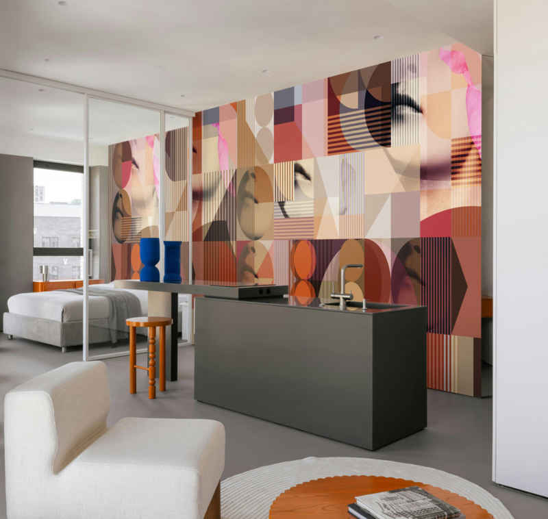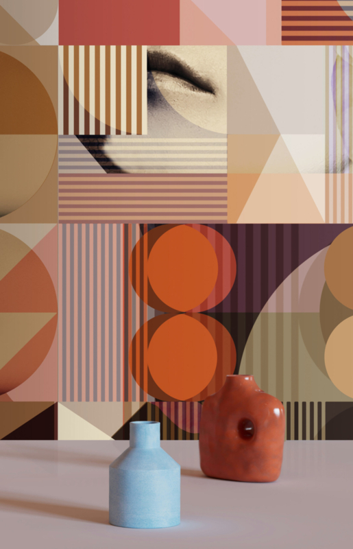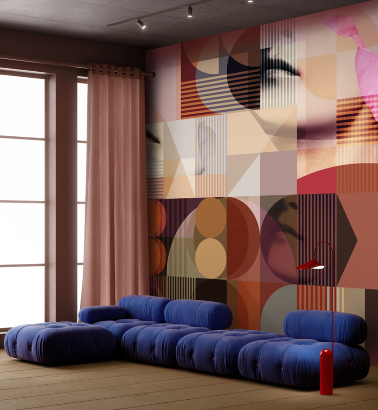 Wallcover “The Coral” by daisy james is a contemporary wallcover featuring an abstract surface composition in warm orange-red tones. Rounded and angular shapes are combined in a layered graphic structure. Subtle fragments of a face are integrated into the design, functioning as a visual element rather than a focal point. The emphasis is on form, colour