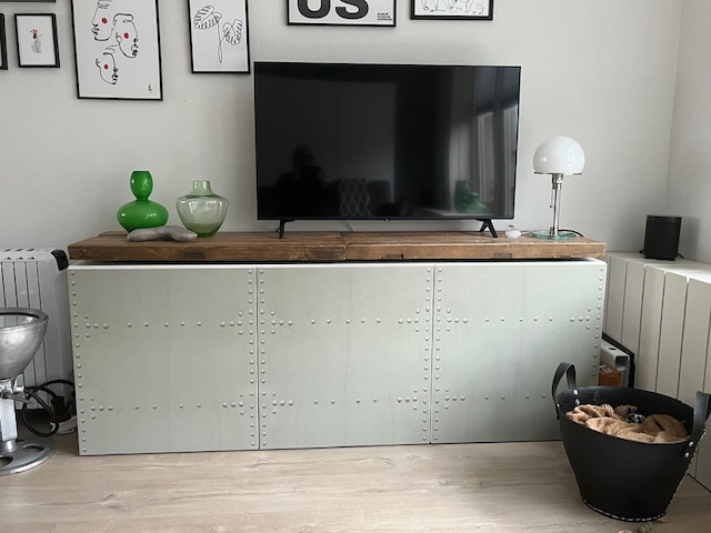 Turn your Besta cabinet into a wonderful industrial piece with our set of stickers with machine green METAL with nails.