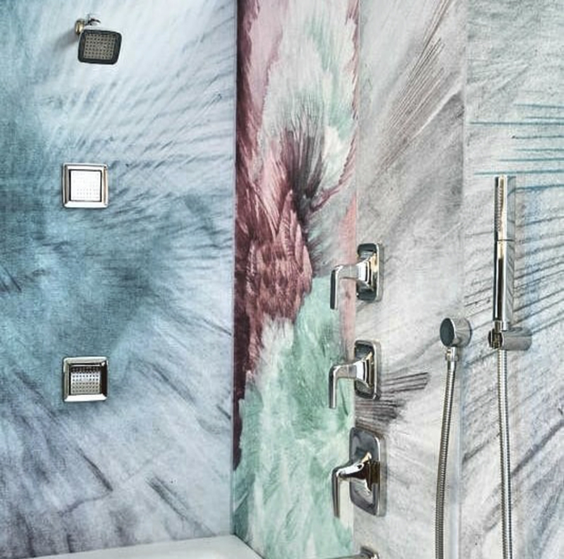 Who needs tiles in the bathroom when you can have this stunning shower wallpaper Big Bang? Patented WET system by Wall & Deco.
