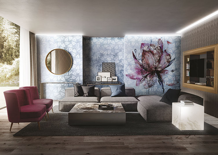 Decorated glass fibre glass for floorings, bathrooms and kitchens. The revolutionary covering with protective and decorative function originates from the cooperation between Inkiostro Bianco and Mapei.