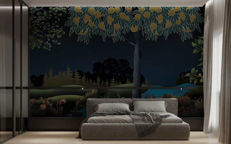 Highly decorated stunning landscape wallpaper mural WILD ORCHARD COLLAGE designed by Sacha Walckhoff for Yo2.